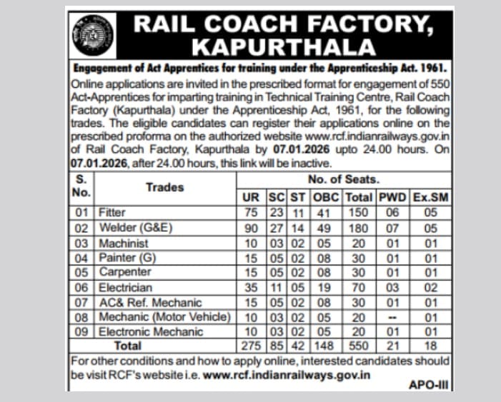 RCF Kapurthala Apprentice Recruitment 2025 — Notification, Vacancy, Apply Online (Trade-wise)