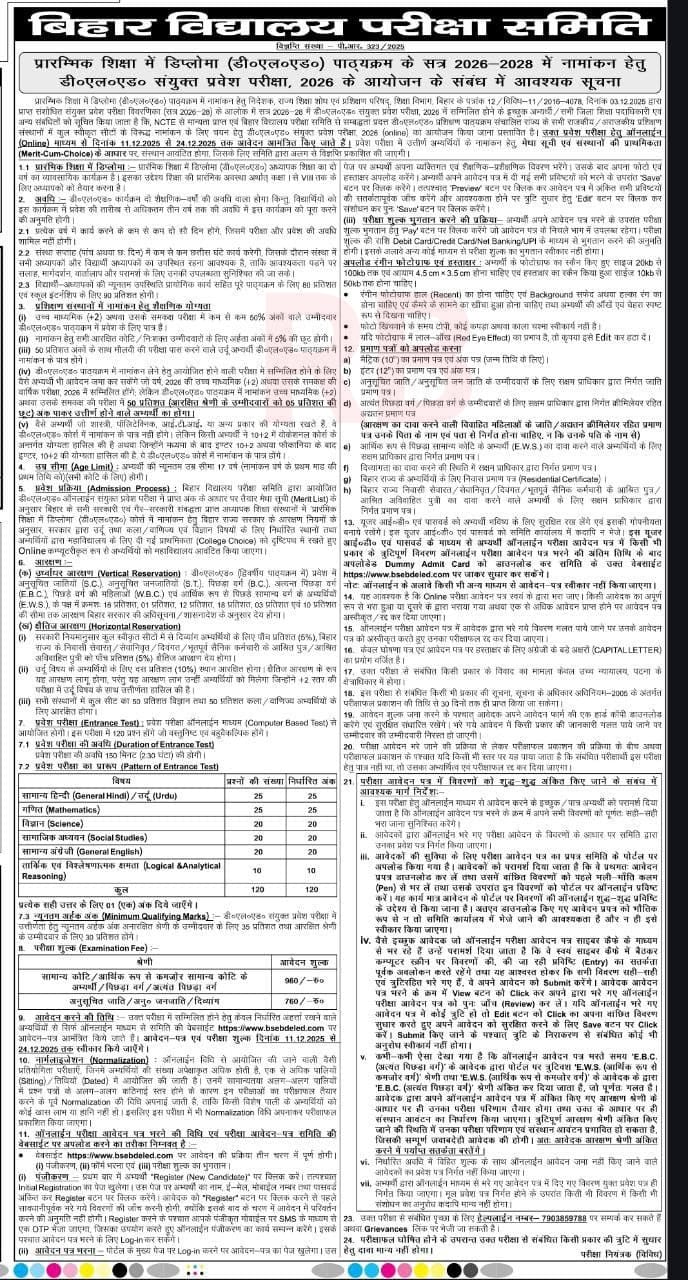 BSEB has published the official notification for admission to the 2-year Diploma in Elementary Education (D.El.Ed) for session 2026–28. Eligible candidates can apply online. Exam window is Jan–Feb 2026 (city-wise schedule to follow).