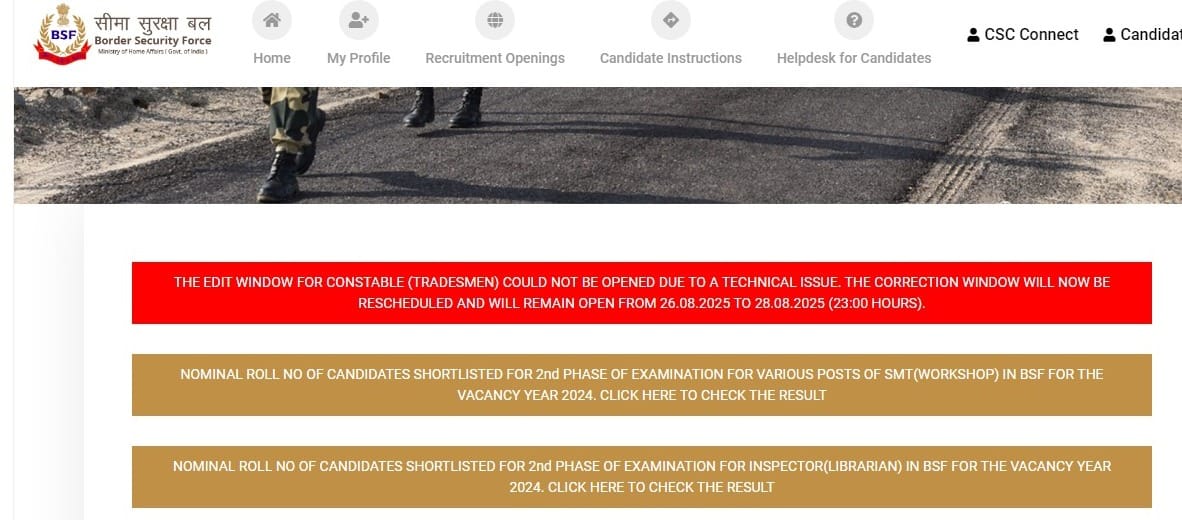 Border Security Force (BSF) has released the PET / PST Admit Card for Constable Tradesman Recruitment 2025. Candidates who applied online between 25 July 2025 to 23 August 2025 can now download their PET / PST admit card by logging in with their Registration Number / Date of Birth.