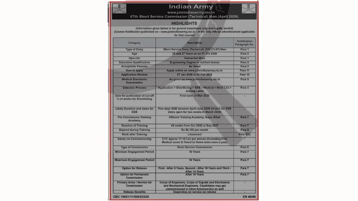 Indian Army has released the official notification for SSC Technical 67th Men Recruitment 2026. Candidates having B.E / B.Tech qualification can apply online. The online application process will start from 07 January 2026 and the last date to apply online is 05 February 2026.