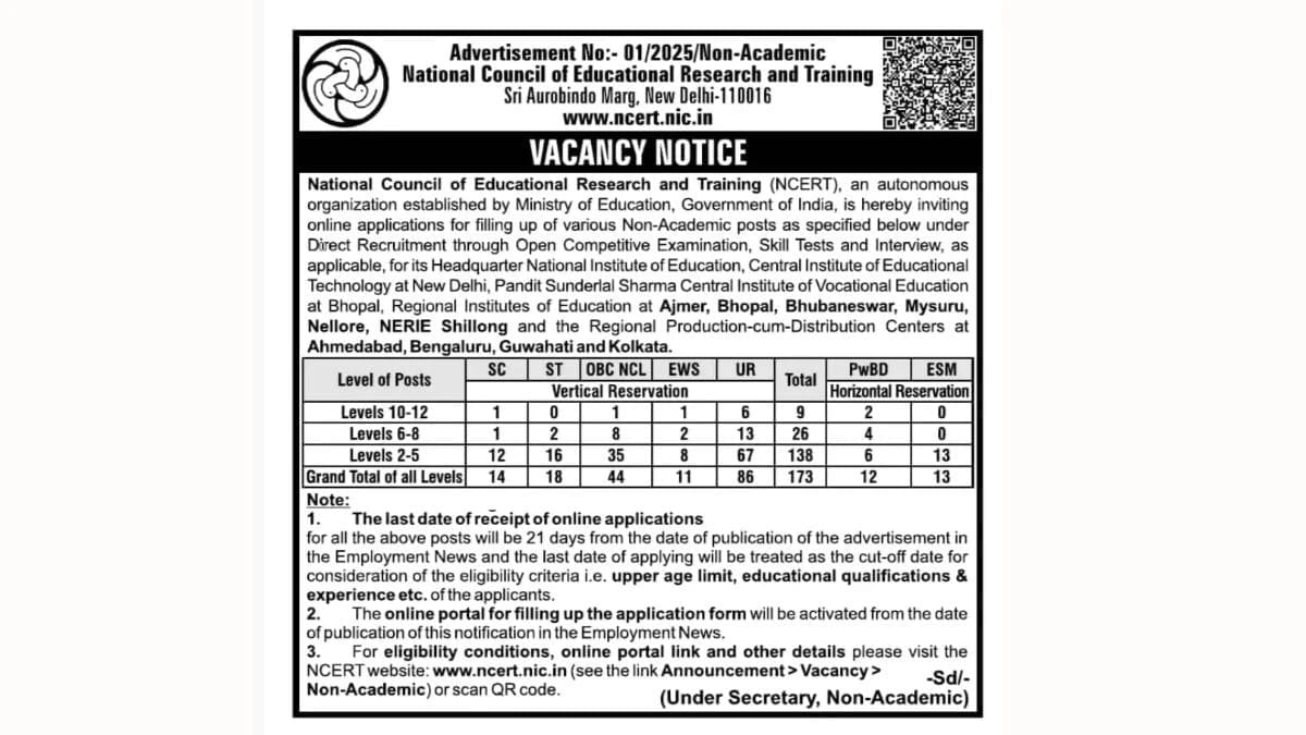 NCERT Non-Teaching Staff Recruitment 2025–26 Apply Online – 173 Vacancies, Eligibility & Notification