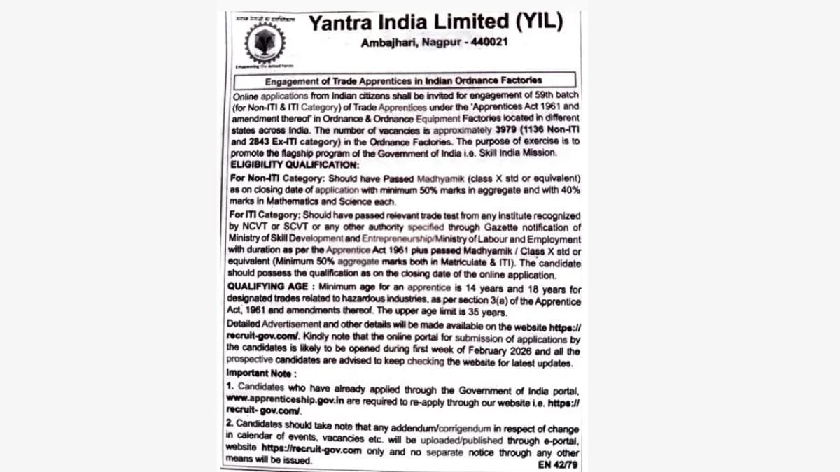 Yantra India Limited YIL Trade Apprentice Recruitment 2026 – Apply Online for 3979 Posts